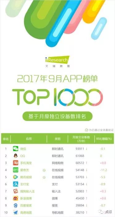 近日,市场研究机构艾瑞发布2017年9月APP榜单,在前十大APP中,微信独占鳌头,月独立设备数超过9亿,排在第十位的高德地图,月独立设备数也接近4亿。也就是说,前十大APP的入门门槛逼近4亿月活。
